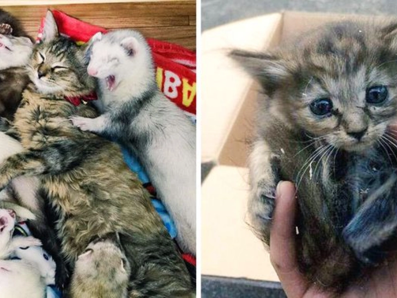 Komari, a stray kitten, was welcomed by a household of five male ferrets. They treated her as a sister, and she grew up believing she was one of them, still cuddling and napping with her brothers.