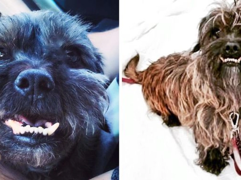 Surrendered because of his teeth and age eight, this dog struggled to find a home. Now he is adored and nicknamed a mini werewolf.