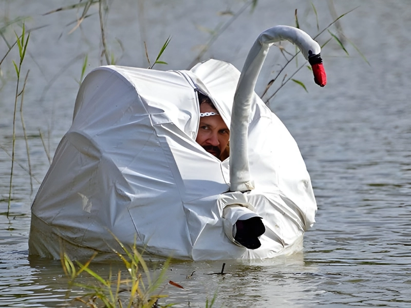One figure glides visually into a serenely white avian tableau. Gentle humor emerges as posture and palette flirt with species ambiguity, crafting a soft narrative about kinship across form.
