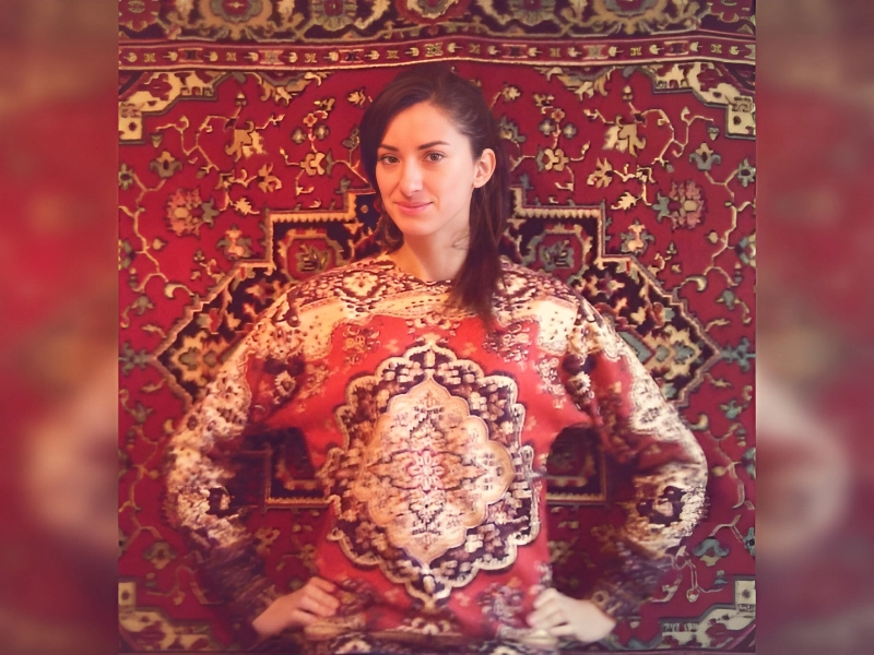 Exact chromatic and motif resonance between garment and rug thins the boundary. The domestic setting becomes an improvised stage for disappearing chic.