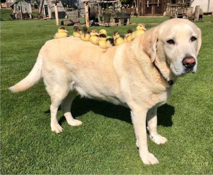 3. After nine ducklings lost their mother, this castle dog adopted them.