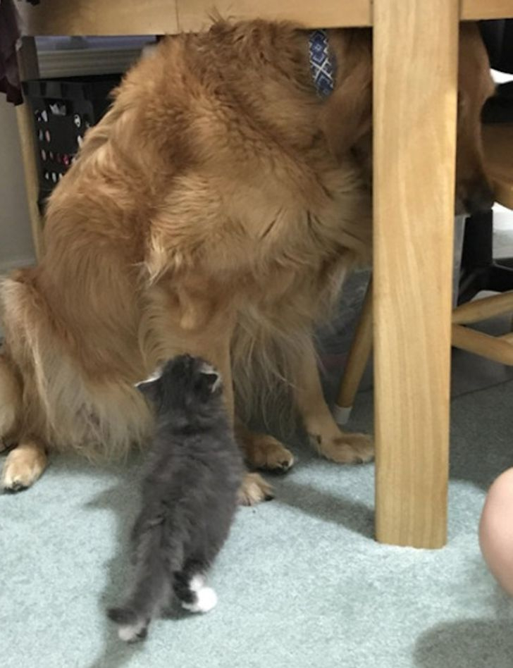 Size means nothing to this tiny ruler. The kitten's fearless posture versus the big dog's caution is pure comedy. It proves again that confidence and attitude often outweigh bulk, and pets keep surprising us.