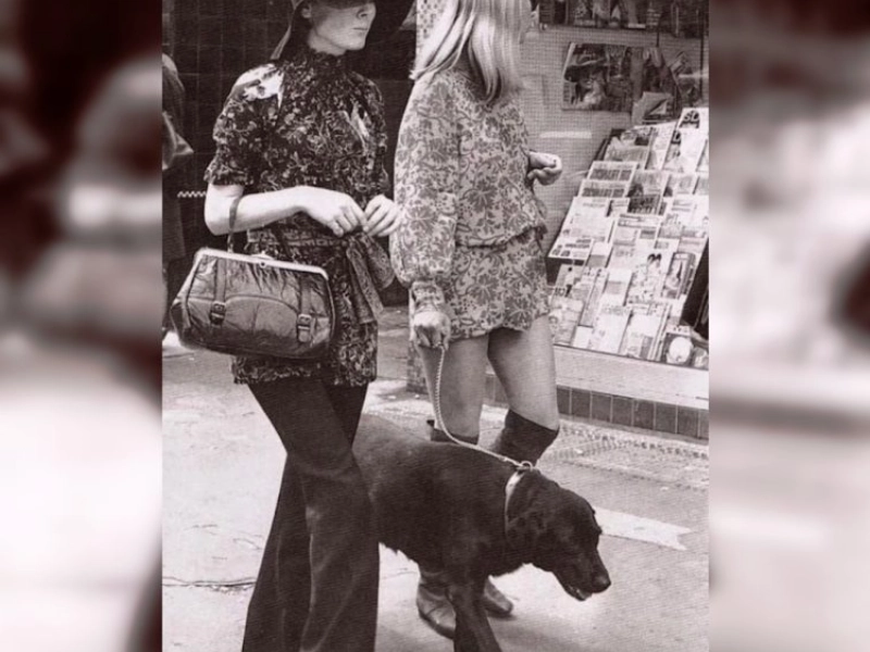 A composed woman holding a puppy conveys warmth, gentleness, and refinement. The image underscores how intimate, quiet moments complemented the decade’s more exuberant fashion narratives.