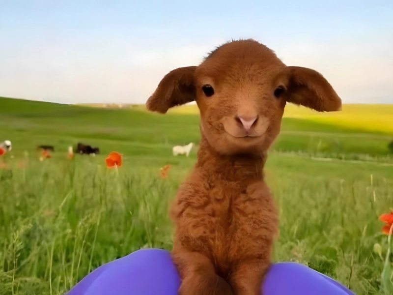 This charming shot shows a small brown kid resting across the photographer's legs. Surrounded by bright blooms and fresh grass with cattle nearby the mood is pure ease and quiet delight.