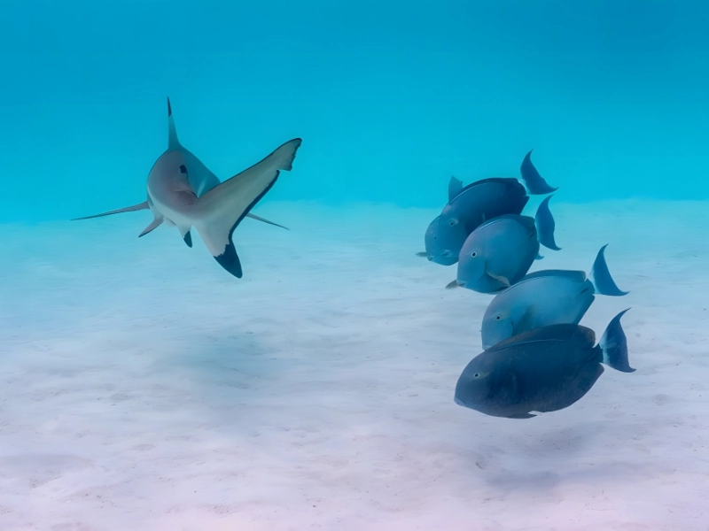 This striking image shows four surgeonfish trailing a black tip reef shark in Moorea French Polynesia. Sharks dominate and the fish pause in respect. The scene hints at strength and balance and was honored in the 2023 Comedy Wildlife selection.