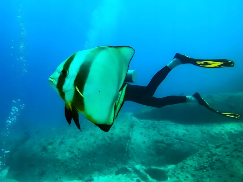 A batfish passes before a diver masking the human form and creating the mermaid effect. A lucky early dive capture.