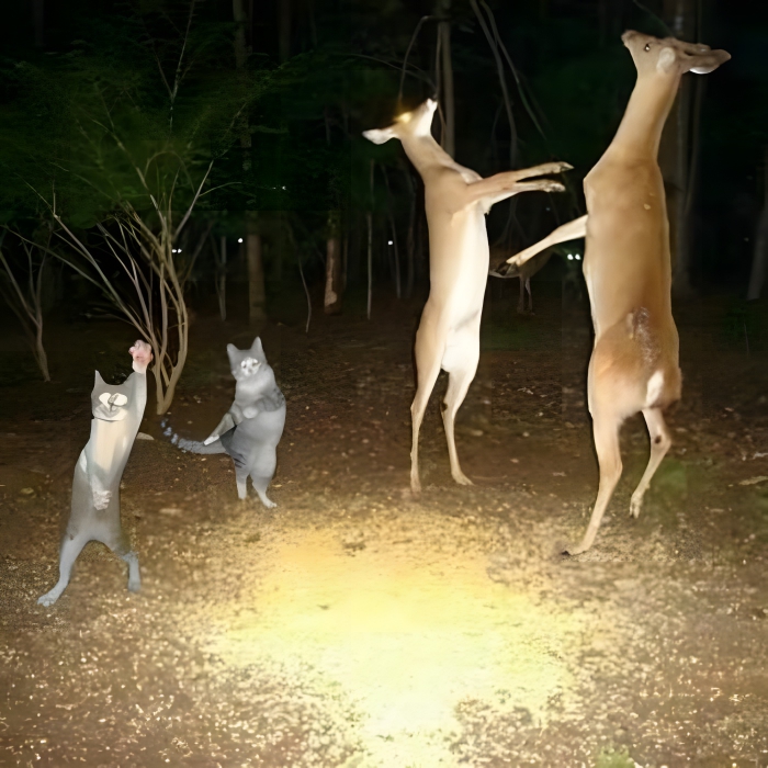 The compelling tension here rests on dual explanations: the rational (opportunistic nocturnal foraging overlapping among species) and the whimsical (a secret woodland assembly). Our pattern seeking architecture happily entertains both before settling. Because darkness erases environmental details, negative space fills with imagined narratives. Each additional second spent scanning reveals another glint or outline, rewarding observers with micro discoveries. The image exemplifies how sparse illumination plus animal eye shine can elevate otherwise ordinary ecological overlap into an eerie, memorable slice of night ecology.