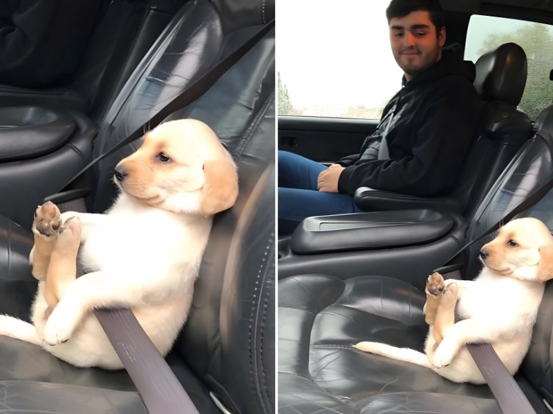 A pup sits buckled in, modeling road safety with calm poise.