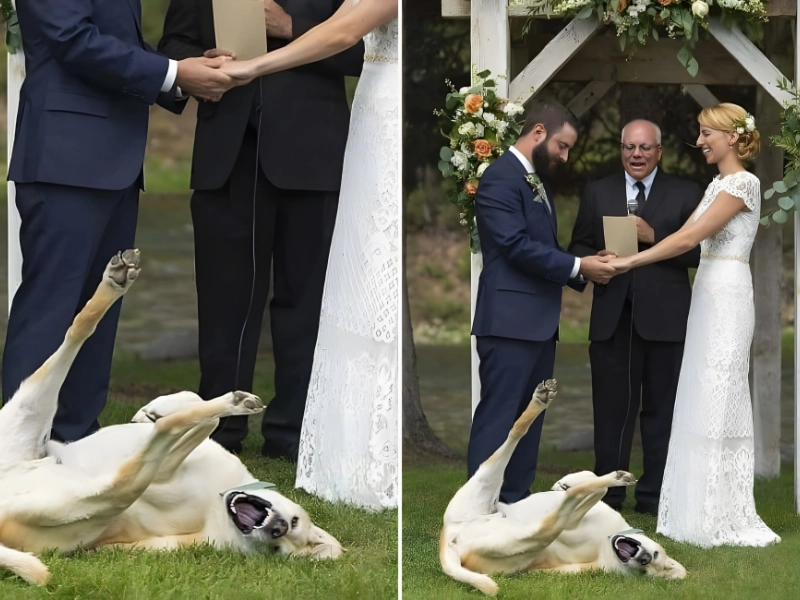 The couple looks elegant while their dog rolls mid ceremony, oblivious.
