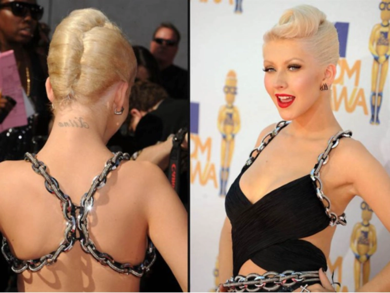Christina Aguilera showcases Xtina beneath her neckline affirming stage persona and fan bond. She has five pieces each tied to a narrative.
