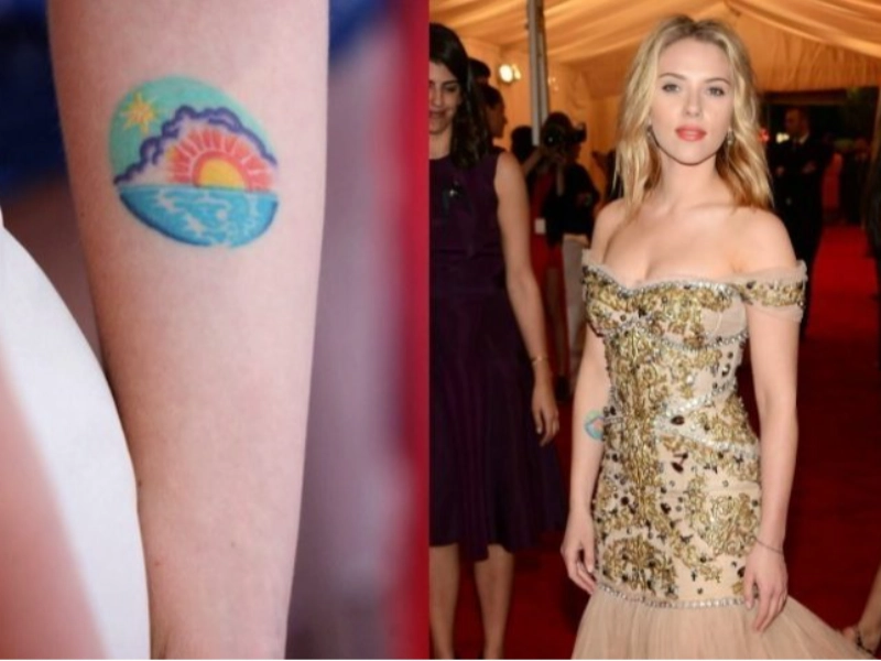 Scarlett Johansson wears ink on wrists ankles ribs and forearms. A vivid sunrise on her left hand signals hope and renewal energizing her collection.